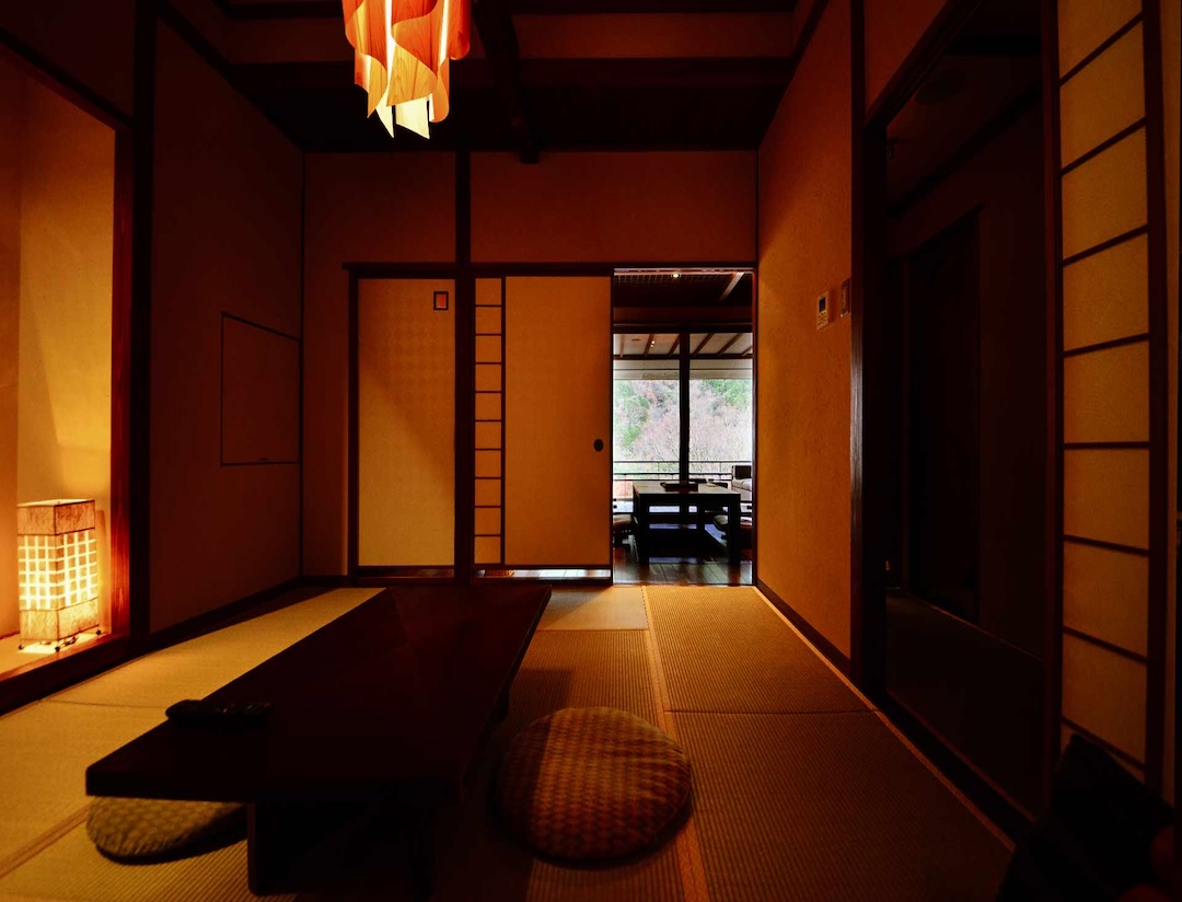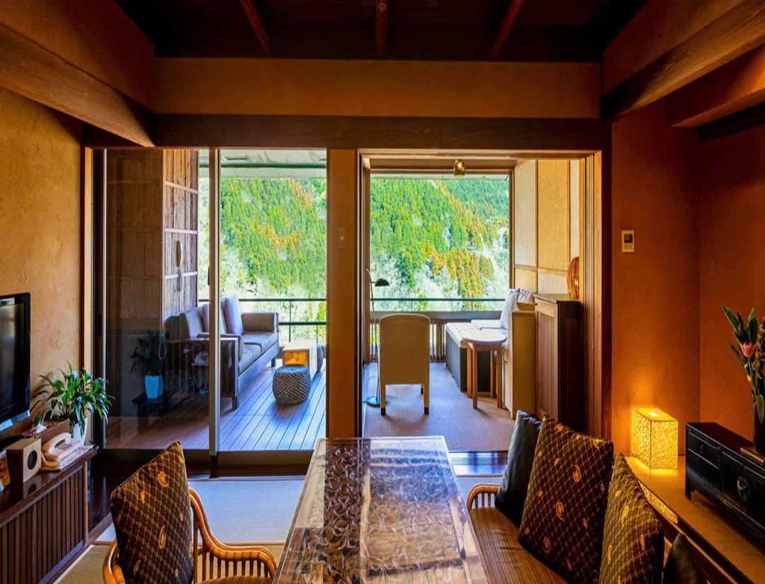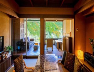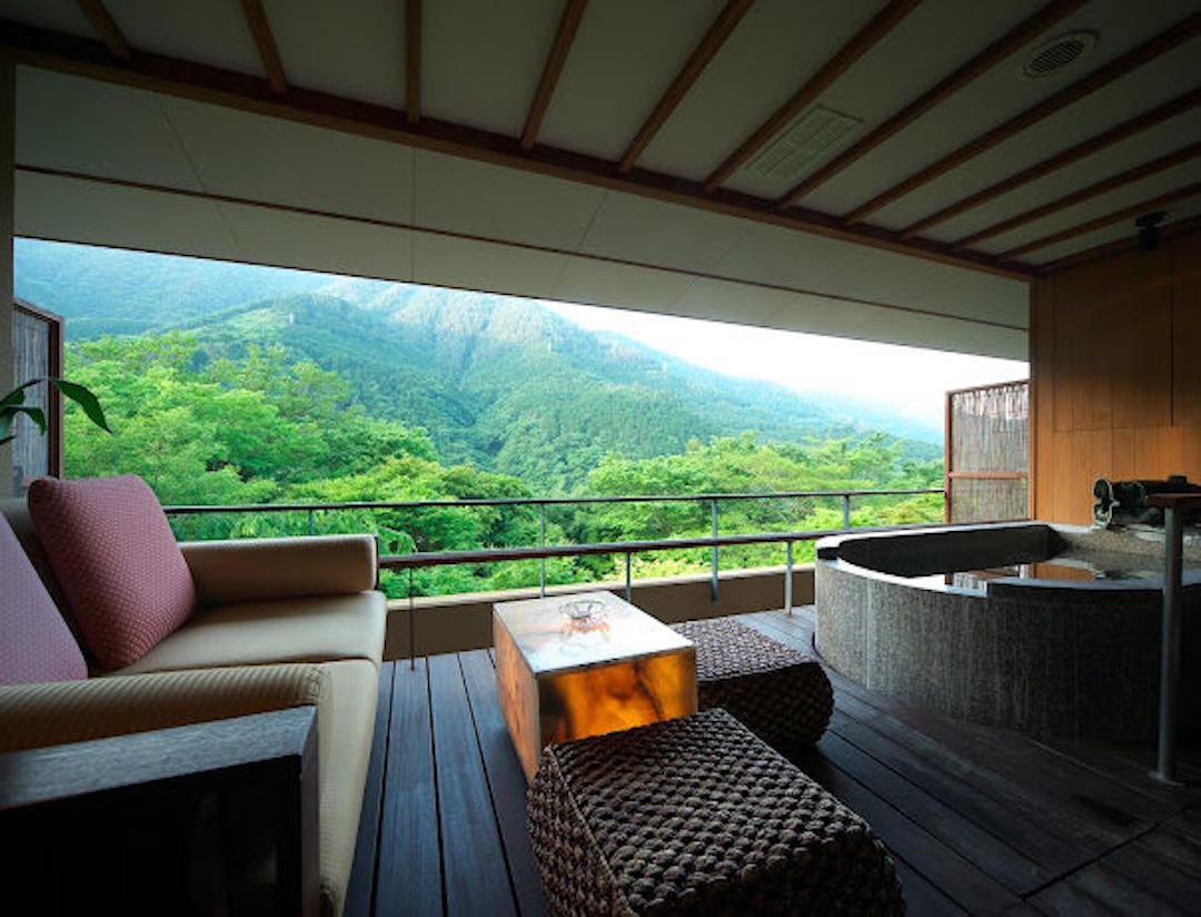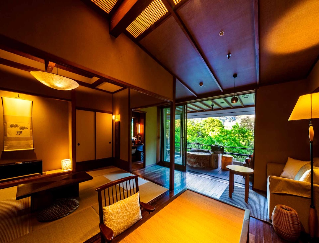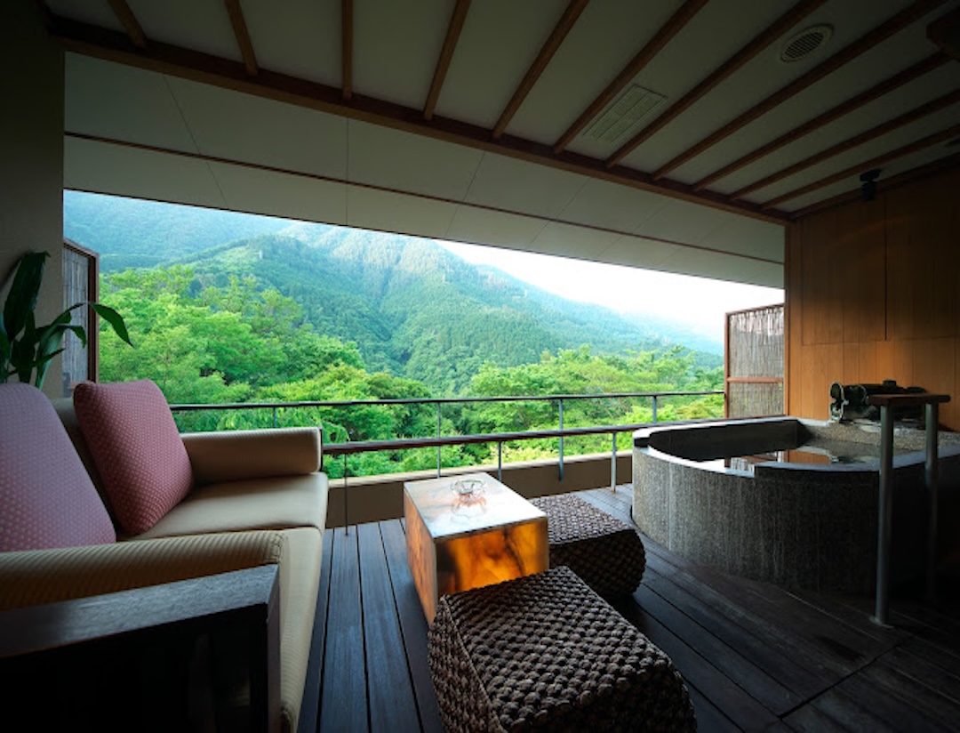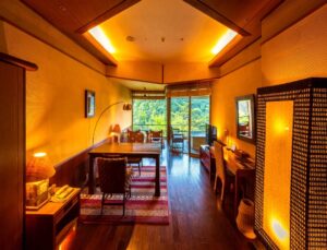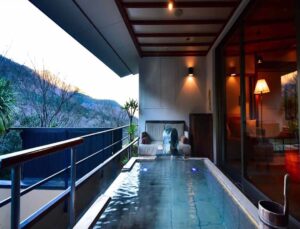 Altitude is about 420m. The ryokan is nestled in a valley, with a view of the Hayakawa River below and the majestic Hakone mountain range, which weaves its way through the four seasons. The view from the top, the healing forest surroundings, the day and night, the season that comes and goes, you can enjoy each unique flavors.