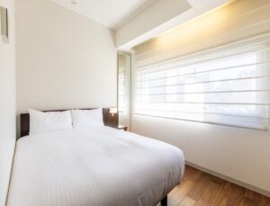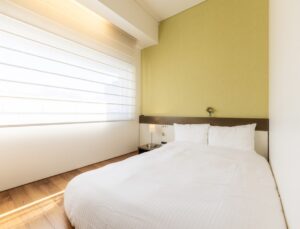 • Concept Flooring: 15 sqm, Double sized bed, City view. It is a room with a low bed on a calm dark-colored flooring. You can take off your shoes and relax in the bed area. Because it is a low mattress type bed, it is also recommended for small children to sleep together.