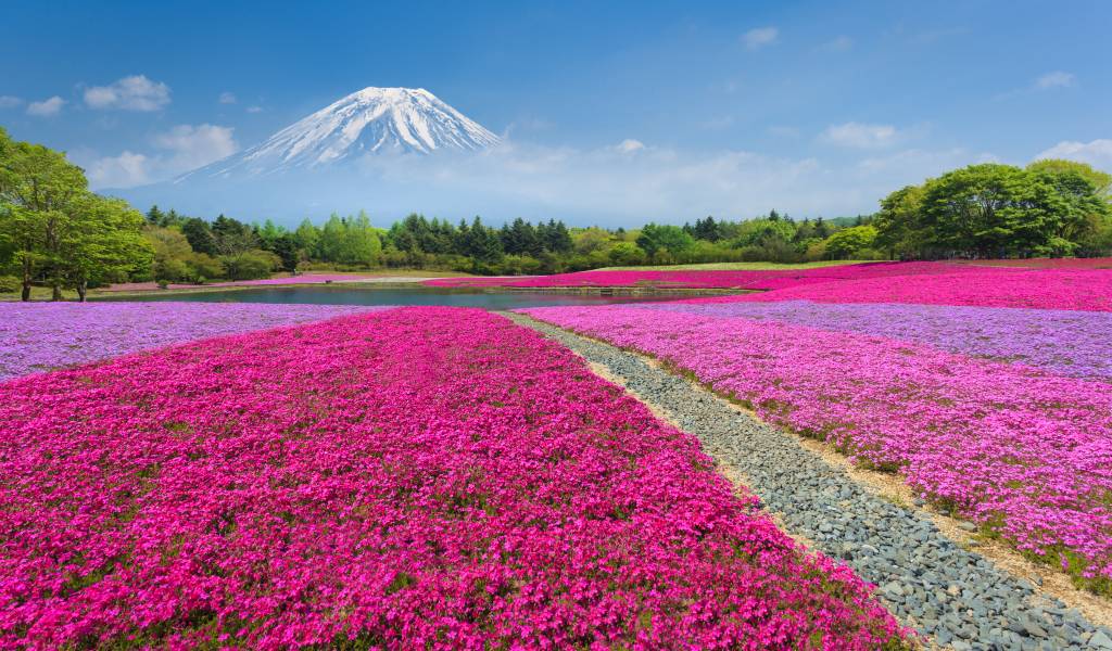 The Fuji Shibazakura Festival during the same time showcases the peak of over 500,000 blooming shibazakura phlox flowers in vibrant colors against the backdrop of Mount Fuji.