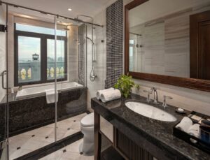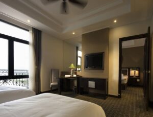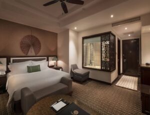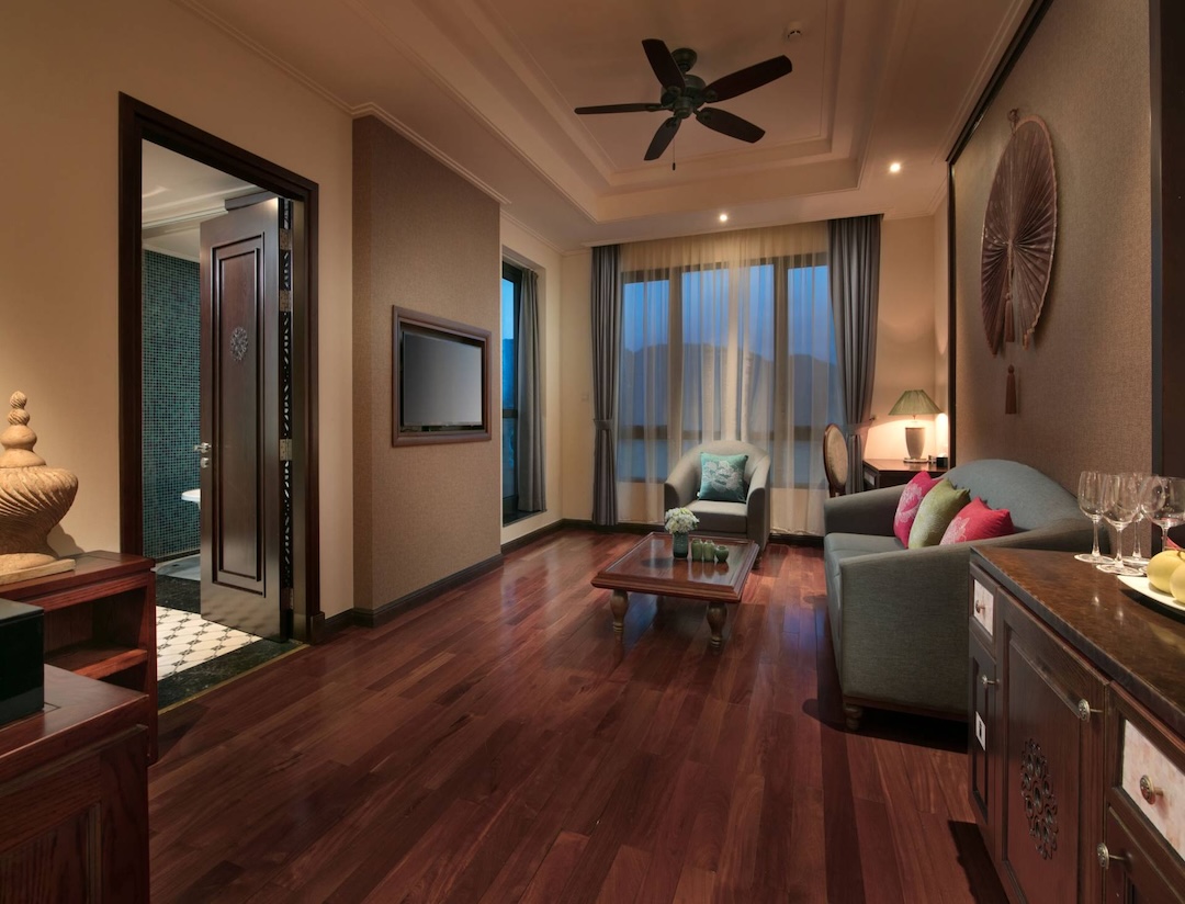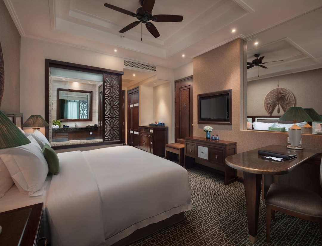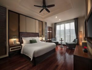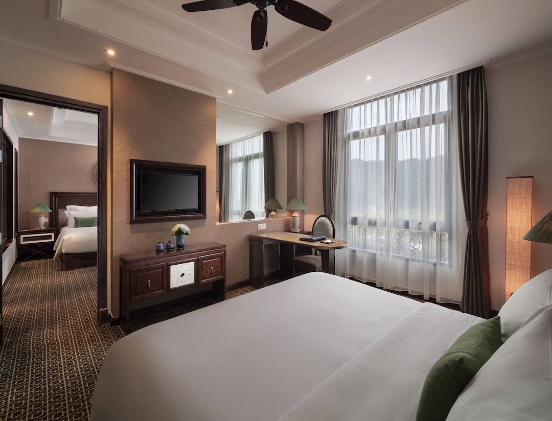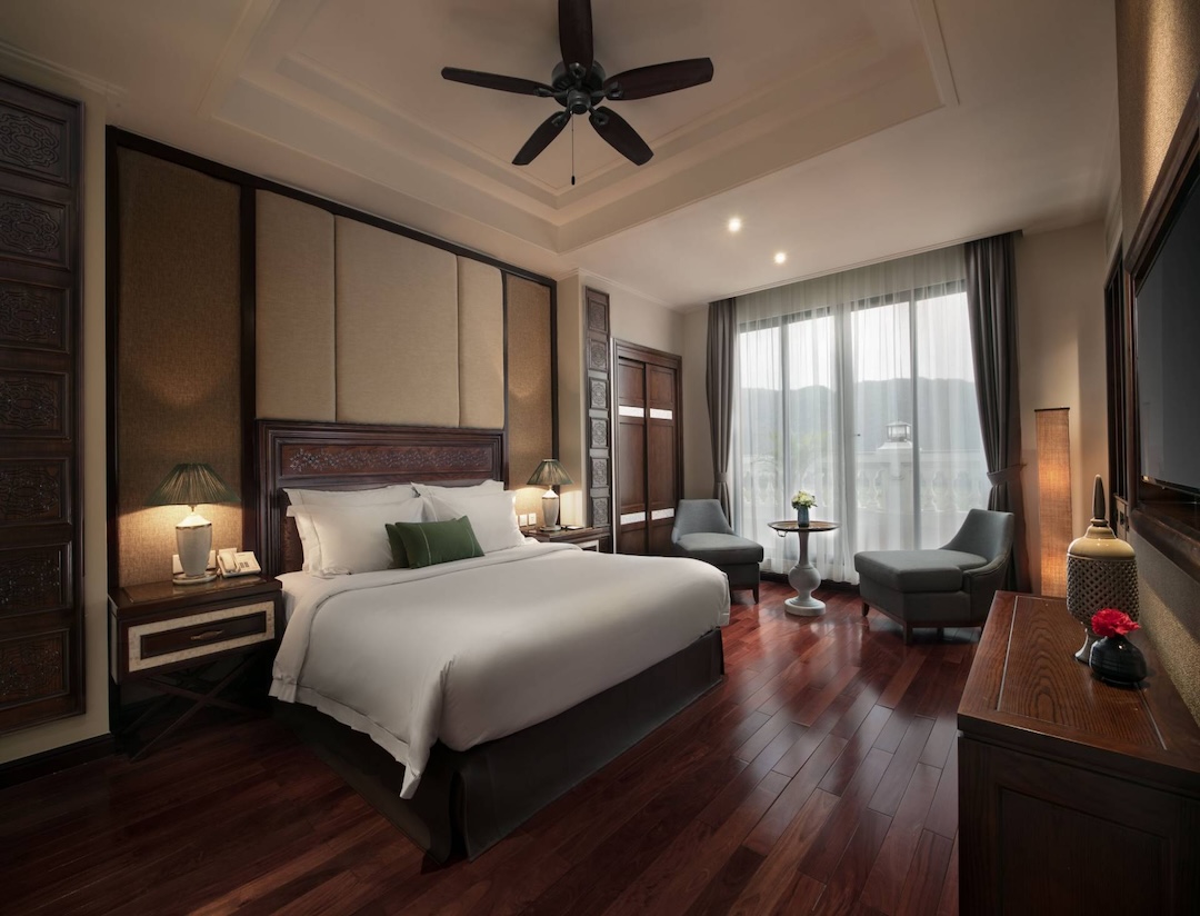 • Fine Art Luxury Suite: 85 sqm, King sized bed, Mountain/ Rice field view. Besides, the room is exquisitely decorated with hand-embroidered pictures of experienced workers and with mosaic ceramic paintings to bring the best feel at Ninh Binh Hidden Charm Hotel & Resort.