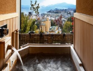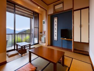 • Sanyaso: 38 sqm, Tatami-mats, Mountain & Lake view. From the room, you can enjoy the view of satoyama landscape and Lake Biwa (toward Lake Minami). The open-air bath with Jacuzzi is the ultimate in luxury, where you can watch the lights reflected on the lake surface at night and heal your body and soul.