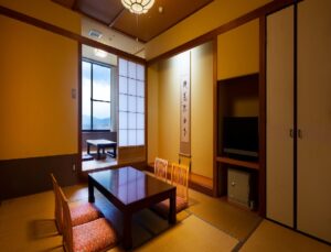 • Executive Satoyama Japanese-Style Western-Style: 80 sqm, Twin sized bed, Mountain & Lake view. This high-class room is equipped with a spacious sunken kotatsu-style talking room, a 12.5-mat Japanese-style room.