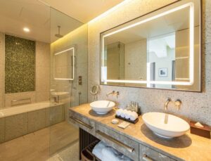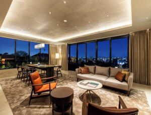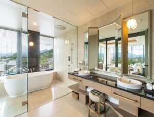 • Panoramic Suite: 137 sqm, King sized bed, City/ Mountain view. The panoramic windows frame sweeping views of the city skyline, the iconic Yasaka Pagoda, and the surrounding mountains.