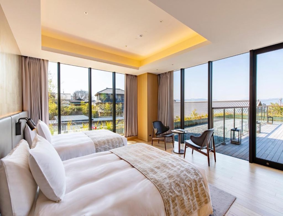 • Panoramic Terrace: 50 -60 sqm, Twin sized bed, Mountain view. This spacious twin room features a private terrace with unobstructed views of Yasaka Pagoda, allowing guests to savor alfresco dining or quiet reflection in a setting steeped in Kyoto’s charm.