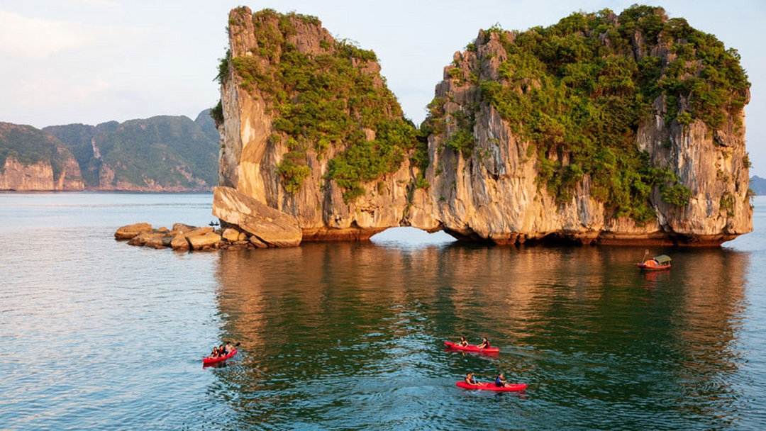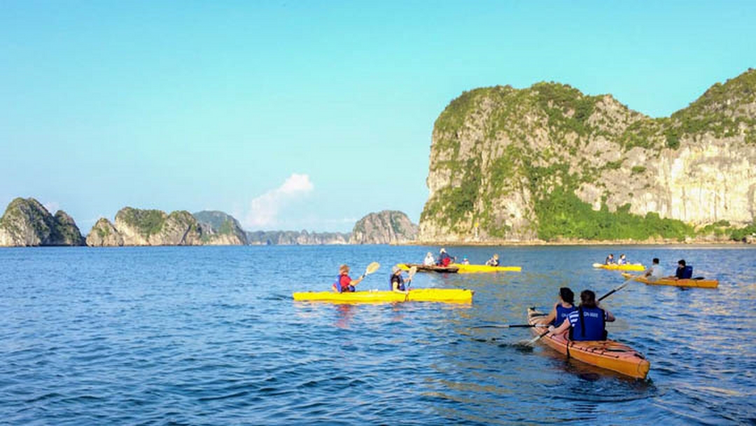 Pick up at your hotel. Take a scenic drive to Halong and check-in procedures at the lounge while having a welcoming special tea. Transfer by  speedboat to the Nostalgia Cruise at Tuan Chau Island. Onboard the Cruise enjoy a refreshing welcome drink. You will have a cruise briefing with safety instructions. A special lunch will be served. We then set sail for Lan Ha Bay. Visit Ao Ech – a little paradise isolated from the hustle and bustle of the outside world. Kayaking at Ao Ech in Lan Ha Bay offers a peaceful and awe-inspiring experience, as if you’re exploring a secret world hidden within pristine nature. Return to Nostalgia Cruise. Admire a sunset on Lan Ha Bay. It is an ideal time for photography enthusiasts to capture the stunning moment of sunset at Lan Ha Bay. As the sun sets, indulge in Happy Hour (buy one, get one free) at the bar, Join the cooking demonstration, where our chef will teach you how to prepare notable Vietnamese dishes. Enjoy dinner at the restaurant on Cruise. After dinner, enjoy the landscape of the bay up on the top deck. Relax while enjoying drinks from the bar. Join squid fishing at night or watch a movie.